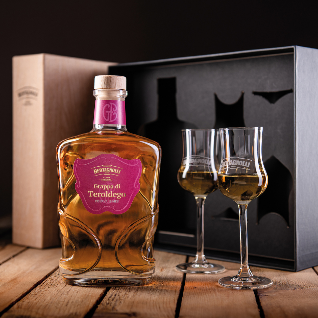 Cofanetto Grappa Teroldego Trentino Ris 18 Mesi con 2 calici grappa
