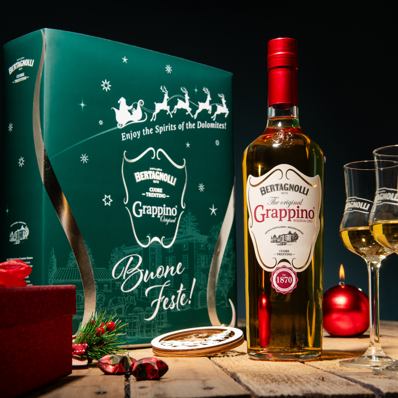 Cofanetto Natale Grappino® Original Riserva Oro 18 Mesi con 2 calici